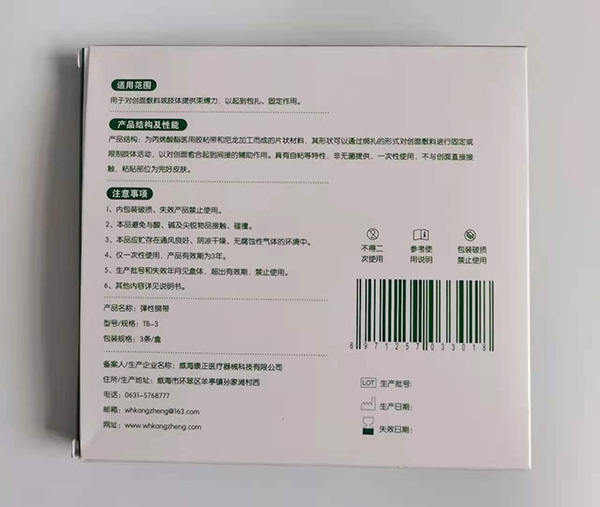 威海康正醫(yī)療器械科技有限公司生產的彈性綁帶為丙烯酸酯醫(yī)用膠粘帶和尼龍加工而成的片狀材料。其形狀可以通過綁扎的形式對創(chuàng)面敷料進行固定或限制肢體活動,以對創(chuàng)面愈合起到間接的輔助作用。具有自粘等特性。該產品為非無菌提供,一次性使用。不與創(chuàng)面直接接觸。粘貼部位為完好皮膚。產品用于術后傷口恢復,為廣大患者減小疤痕增生提供了方便。